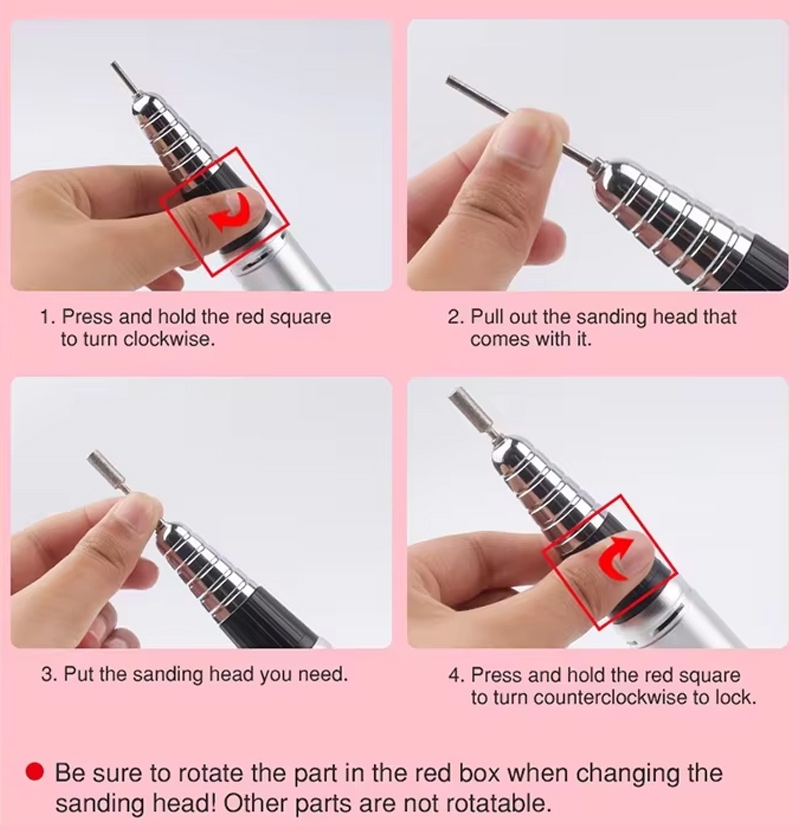 Diese elektrische tragbare Gel-Nagelbohrer-Ersatzbohrer-Betriebsmethode mit 35.000 U/min, d. h. Einstecken und Herausziehen, einfach und bequem, der Austausch kann nach der Fertigstellung verwendet werden.