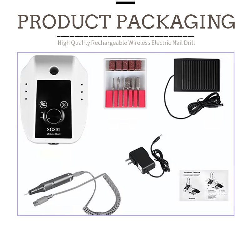 Der Inhalt dieses elektrischen, tragbaren Gel-Nagelbohrers mit 35.000 U/min umfasst einen Schleifstift, ein USB-Ladekabel, eine Bedienungsanleitung für das Produkt und eine leichte und tragbare Box.