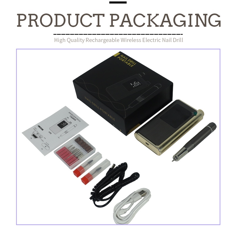 Der Inhalt dieses professionellen Hochgeschwindigkeits-Nagelbohrers mit 40.000 U/min umfasst ein Schleifstiftprodukt, ein USB-Ladekabel, eine Produktanleitung und eine leichte und tragbare Box.