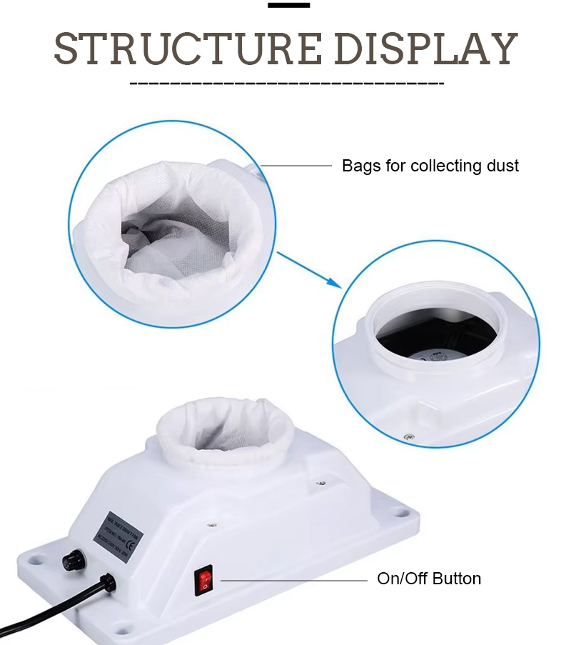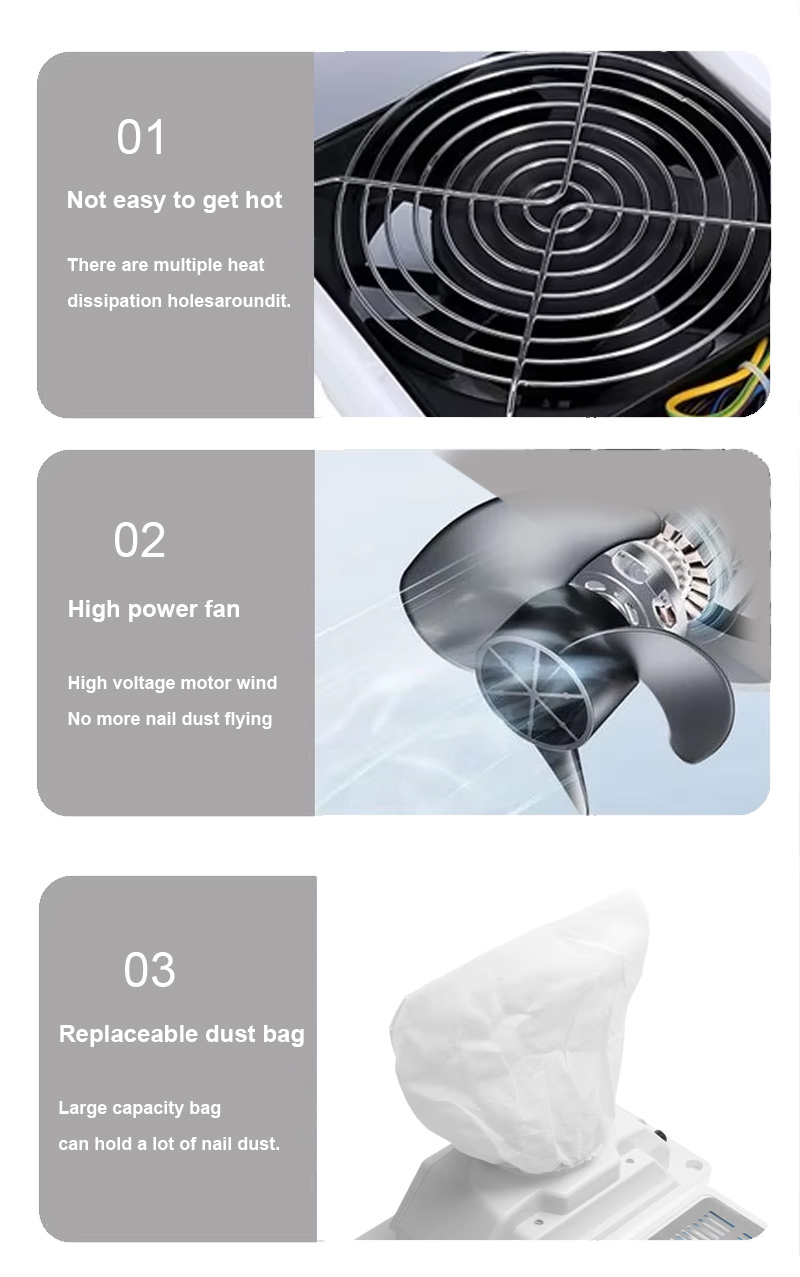 Durch die starke Adsorption von Nagelresten tritt kein Staub aus. Halten Sie die Arbeitsplatte sauber und ordentlich. Durch schnelles Staubsaugen tritt kein Staub aus. Hohe Leistung und effizientere Leistung.