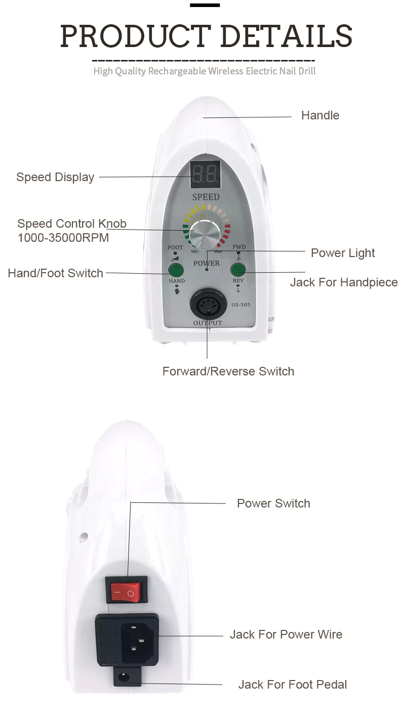 Wiederaufladbares Nagelbohrer-Set mit leistungsstarkem Handstück, 45 W, 35.000 U/min