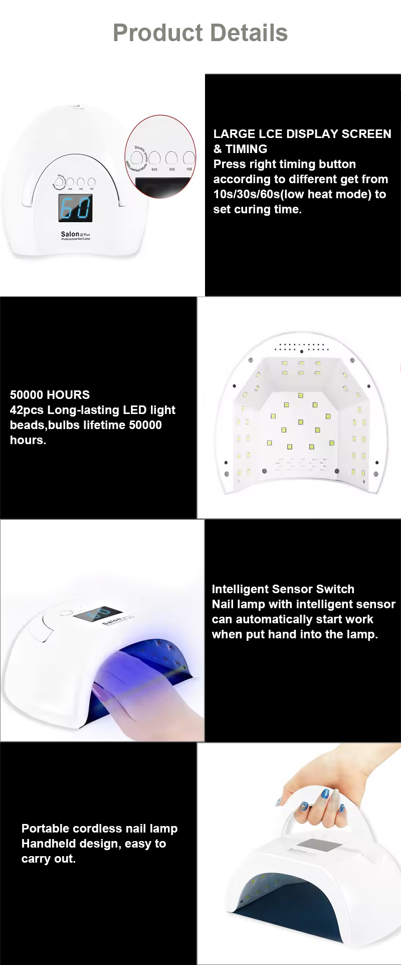 Zu unseren Hauptprodukten gehören LED-Nagellampen: 186 W/168 W/86 W/84 W/80 W/75 W/72 W/65 W/60 W/54 W/50 W/48 W/36 W/24 W/16 W/12 W/6 W/3 W usw. Wiederaufladbare kabellose Modelle: 156 W/120 W/96 W/90 W/86 W/84 W/80 W/72 W/66 W/64 W/60 W/54 W/48 W usw. Nagelkunstbohrer: 80 W/65 W/60 W/45 W/35 W/25 W/15 W usw. Drahtlose Lademodelle: 45 W, 35 W, 30 W, 25 W, 20 W, 15 W usw. 25.000 U/min/30.000 U/min/35.000 U/min/40.000 U/min/45.000 U/min/bürstenlos/Ultrahochgeschwindigkeits-bürstenlos. Vollständiger Staubsammler. 80 W/68 W/60 W/48 W/45 W/40 W/36 W/30 W/25 W/20 W/15 W/6 W usw., kabellose Lademodelle: 80 W, 60 W, 40 W, 30 W.