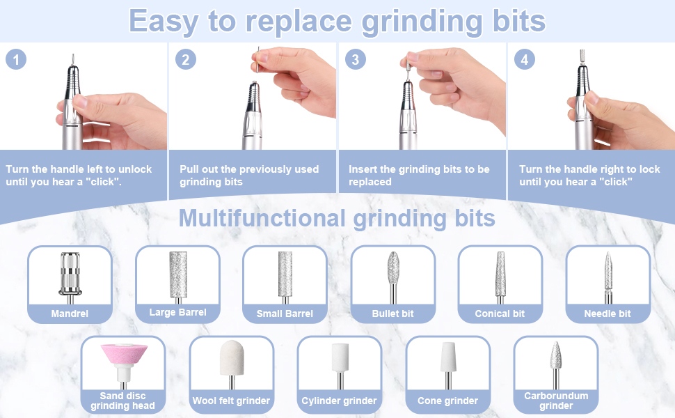 Dieses geräuscharme, tragbare Nagelbohrset hat 2 Farben zur Auswahl: Schwarz/Weiß/Grau/Blau/Rot/Rosa/Orange, bunte Farben.