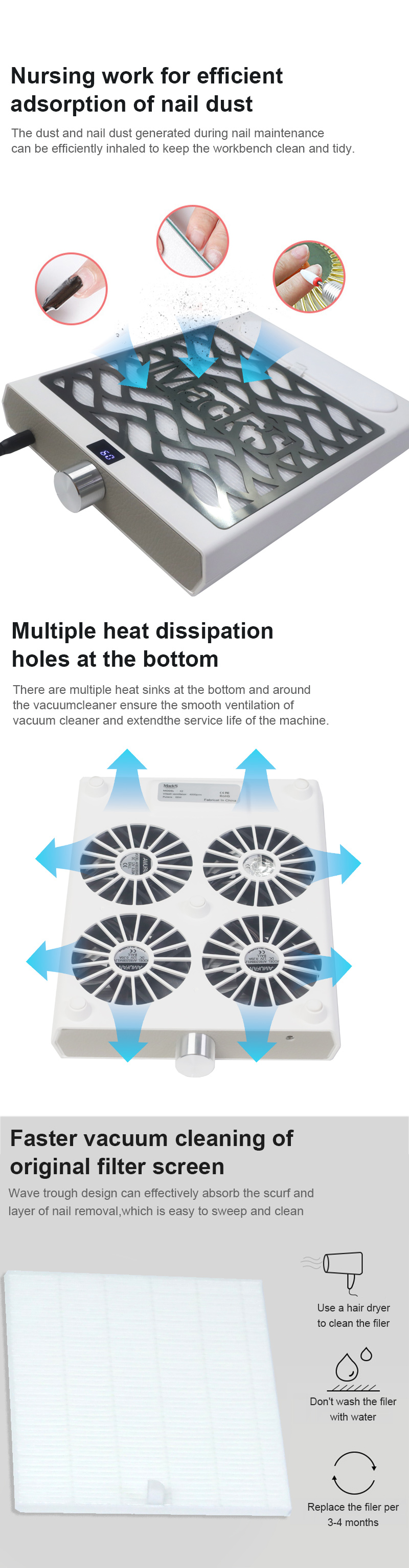 Durch die starke Adsorption von Nagelresten tritt kein Staub aus, die Arbeitsplatte bleibt sauber und ordentlich, beim schnellen Staubsaugen tritt kein Staub aus, hohe Leistung und effizienter.
