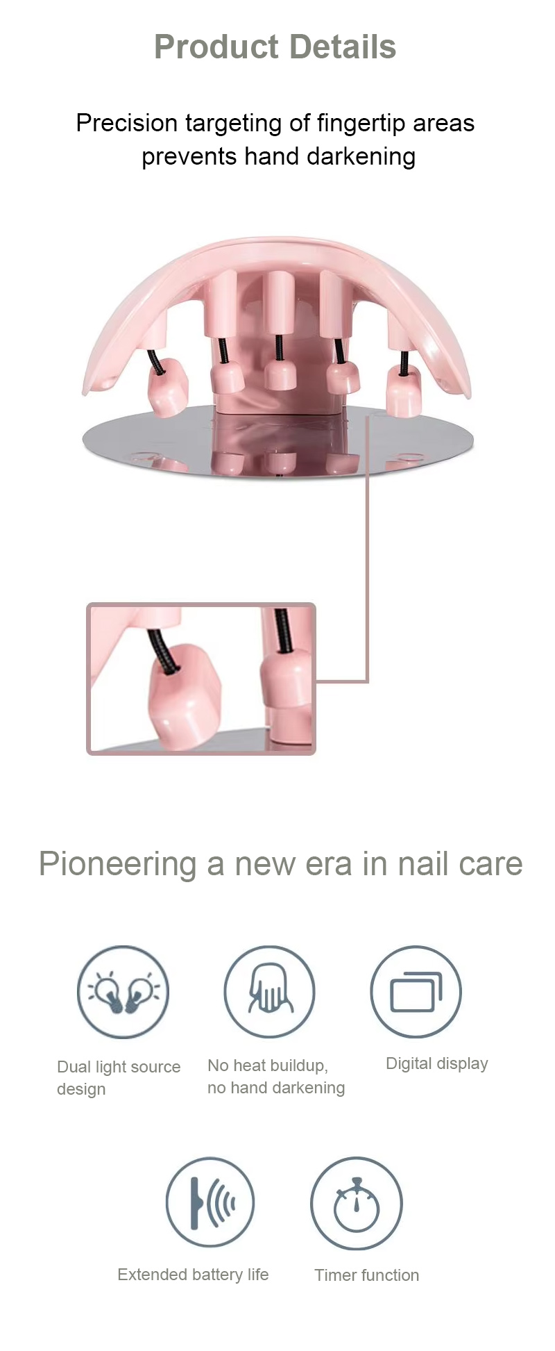 Das Produkt sorgt für eine gleichmäßige Leimtrocknung ohne Schrumpfung. Die beiden Lichtquellen sorgen für eine sanfte Erwärmung, um Verfärbungen der Hände und Augenbelastungen vorzubeugen. Sie eignen sich sowohl für Hände als auch für Füße und liefern bemerkenswert schnelle Trocknungsergebnisse.