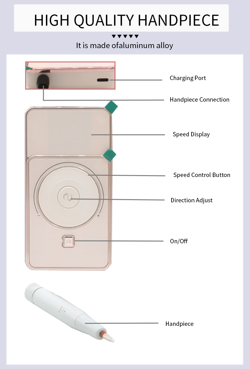 Dieses geräuscharme Hochgeschwindigkeits-Schleifstift-Display-Design mit Schleifstiftsockel, LCD-Flüssigkristallanzeige kann die Anzahl der Umdrehungen/Leistung/Richtung anzeigen, Geschwindigkeitsschalterknopf, Umschalttaste im Uhrzeigersinn/gegen den Uhrzeigersinn, Pausentaste, professioneller Motor mit 30.000 U/min, einschraubbarer Schleifkopf mit Verriegelung.