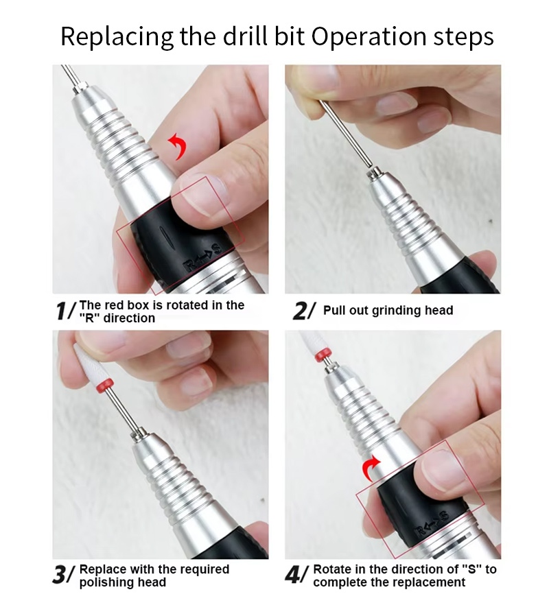 Diese professionelle Akku-Elektro-Nagelbohrer-Ersatzbohrer-Betriebsmethode, d. h. Einstecken und Herausziehen, einfach und bequem, Austausch kann nach Abschluss verwendet werden.