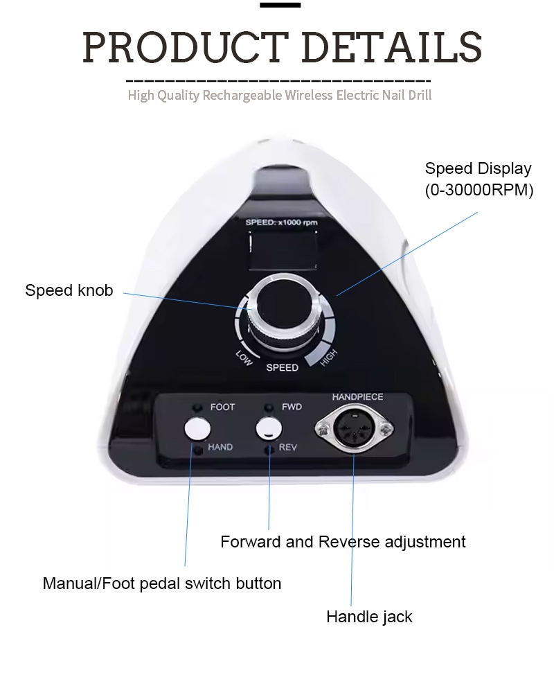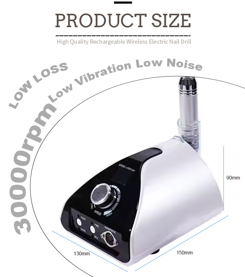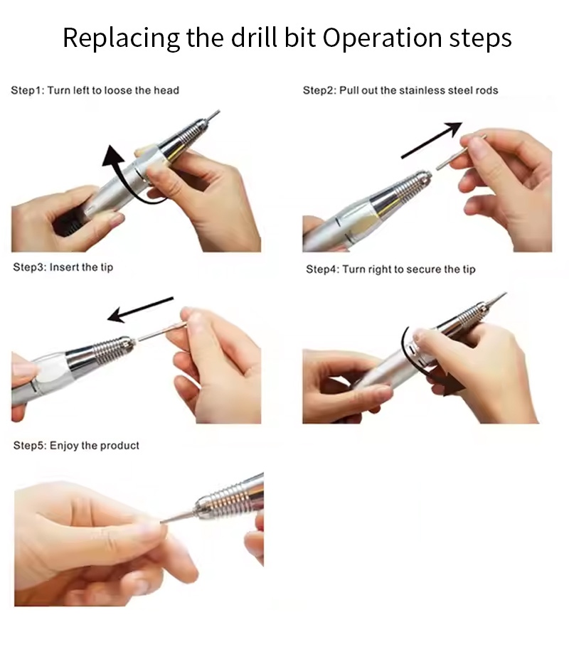 Diese professionelle tragbare Nagelbohrmaschine mit 35.000 U/min Ersatzbohrer-Betriebsmethode, das heißt, einstecken und herausziehen, einfach und bequem, der Austausch kann nach der Fertigstellung verwendet werden.