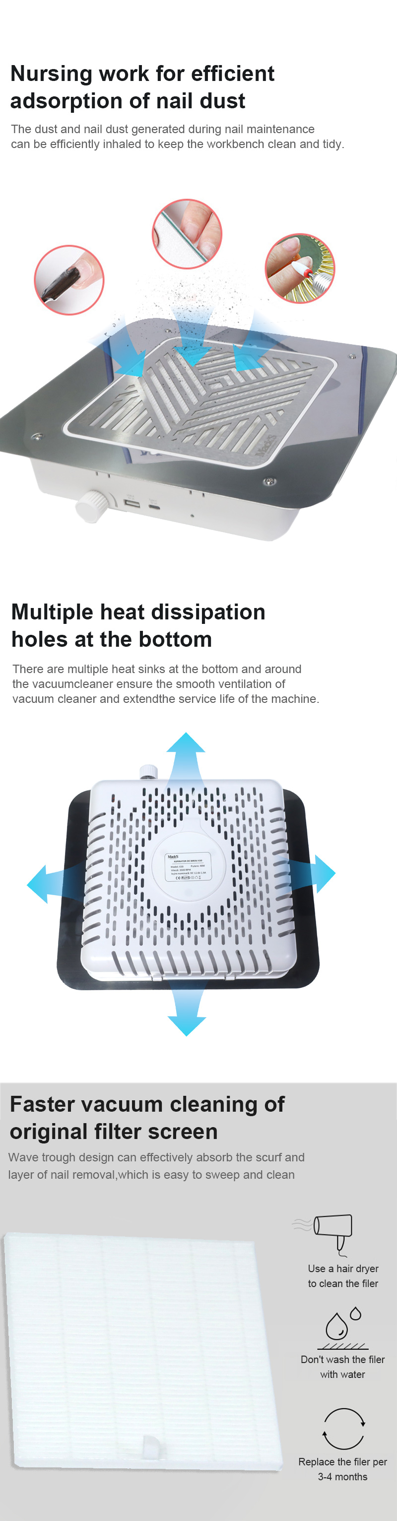 Durch die starke Adsorption von Nagelresten tritt kein Staub aus, die Arbeitsplatte bleibt sauber und ordentlich, beim schnellen Staubsaugen tritt kein Staub aus, hohe Leistung und effizienter.